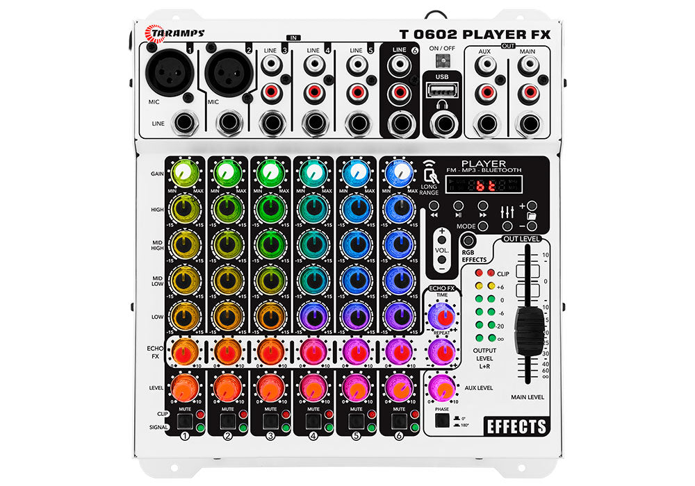 El Mixer T-0602 Player FX Multicolor combina versatilidad y diseño con LED RGB y 78 efectos de iluminación, incluido modo VU sincronizado con la música.
