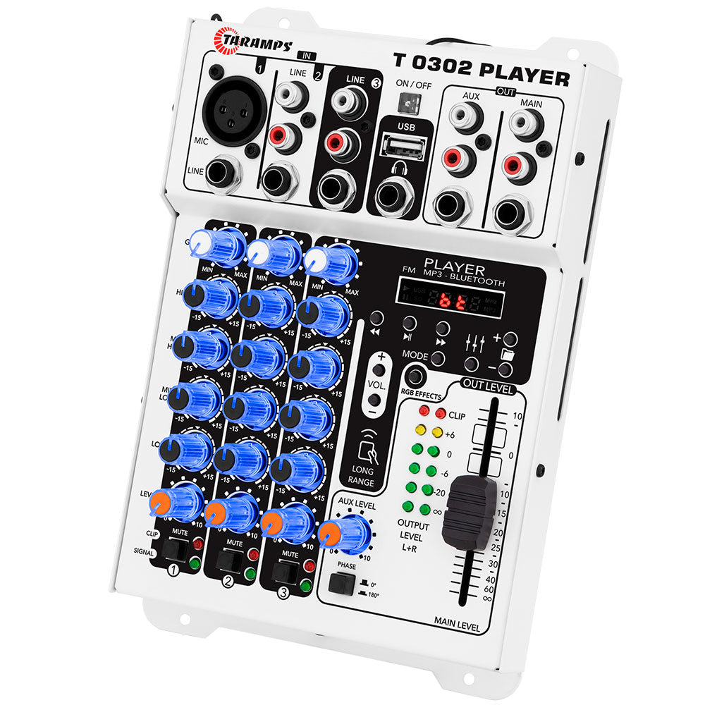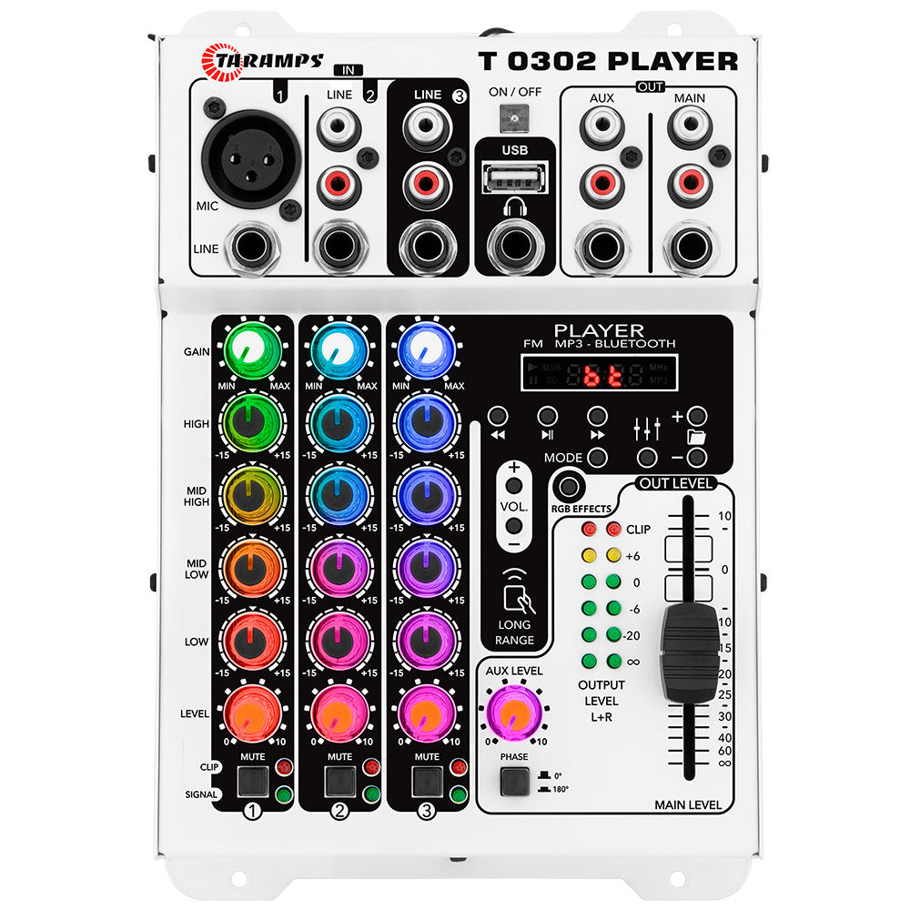 La Mixer T-0302 Player Multicolor une versatilidad y diseño con un impactante sistema de iluminación LED RGB, ofreciendo 72 efectos de luz, incluido modo VU sincronizado con la música para una experiencia visual dinámica.